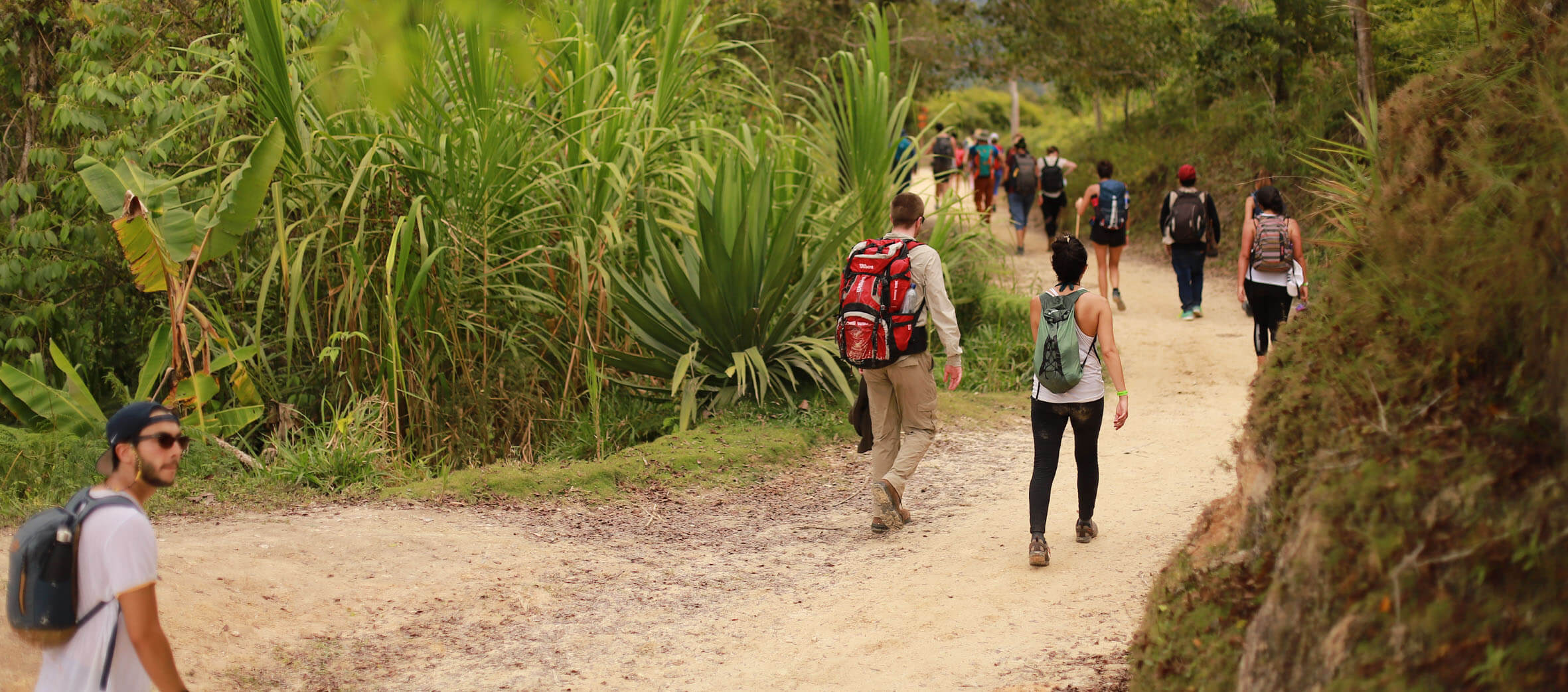 Group of hikers on a jungle trail in Sierra Nevada de Santa Marta, Colombia